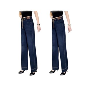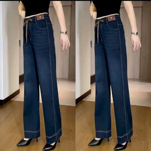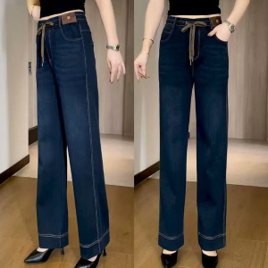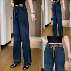 秋冬新款时尚高腰抽绳显瘦窄版牛仔裤女士休闲百搭松紧腰直筒长裤
