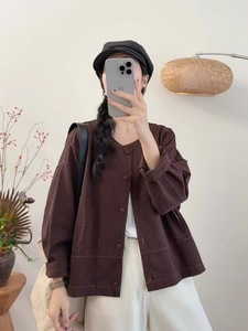 古咖服饰秋季新款棉质纯色外套女圆领单排扣休闲长袖外搭开衫上衣