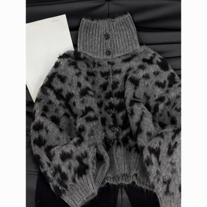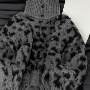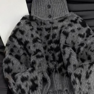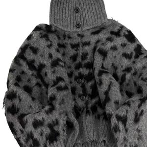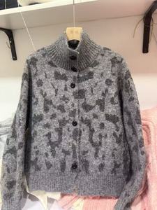 设计感撞色高领豹纹毛衣外套女2024秋冬款韩系慵懒风时尚洋气上衣