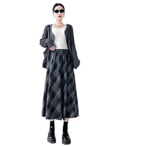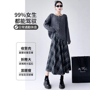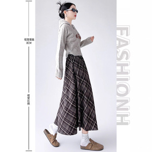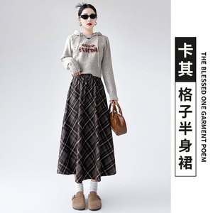 格子毛呢半身裙半裙2025秋装新款女装复古松紧腰裙子中长款A6329