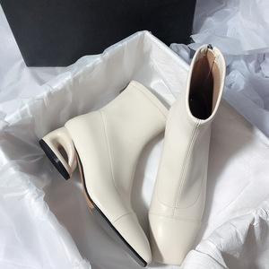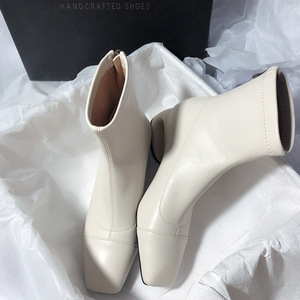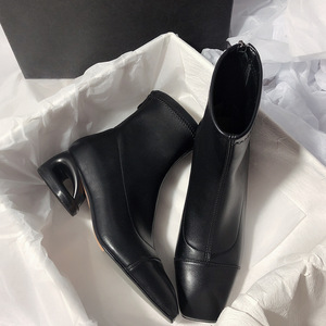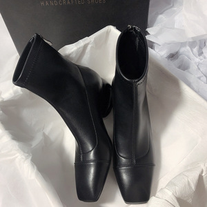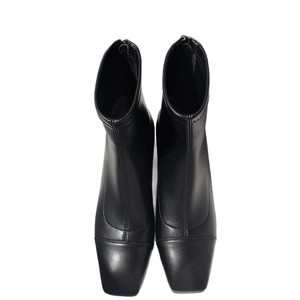 方头粗跟后拉链中跟优雅气质镂空异型跟时装瘦瘦靴