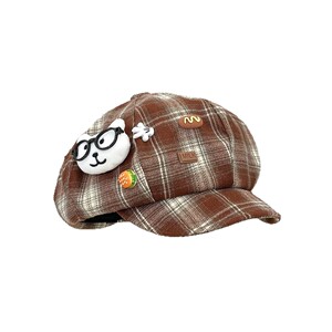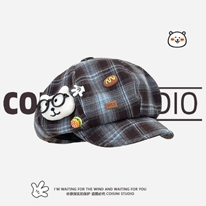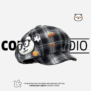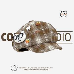 韩系自嘲熊玩偶格纹八角帽子女春秋可爱宅系y2k百搭显脸小贝雷帽