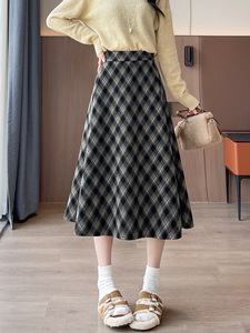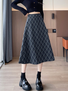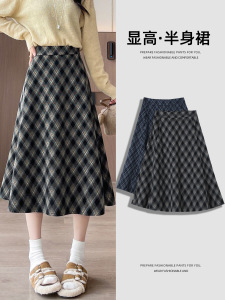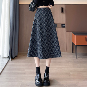 松紧腰格子半身裙女中长款2025秋冬新款显瘦蓝灰格a字半身裙A6187
