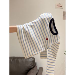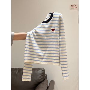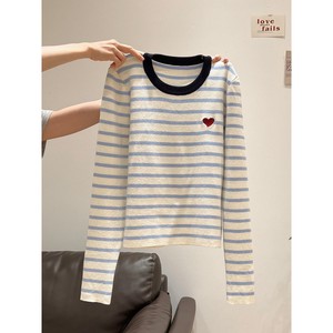 蓝色条纹爱心刺绣圆领长袖针织打底衫女秋冬内搭修身卡腰短款上衣
