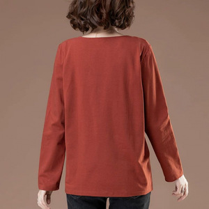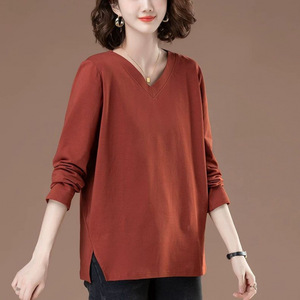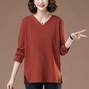 2-300斤中年妈妈秋装新款长袖T恤女宽松大码时尚开叉v领上衣女ins