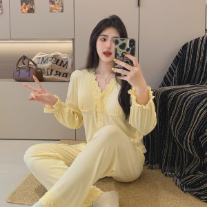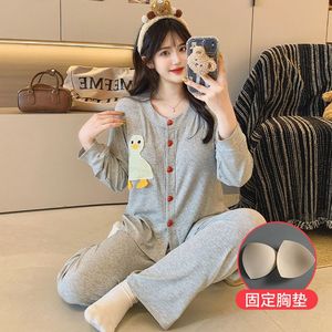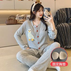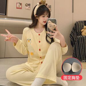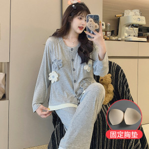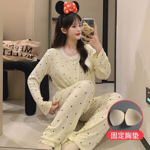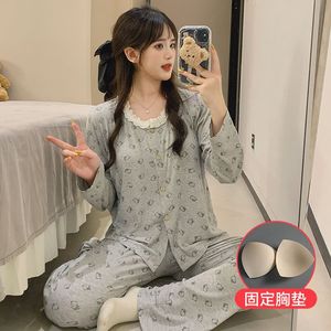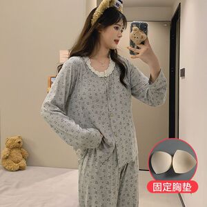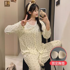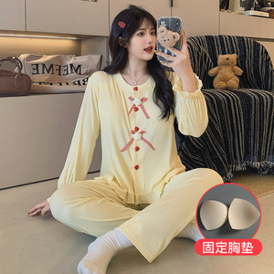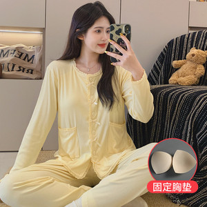 睡衣女莫代尔带胸垫春秋季薄款长袖甜美可外穿开女士家居服套装