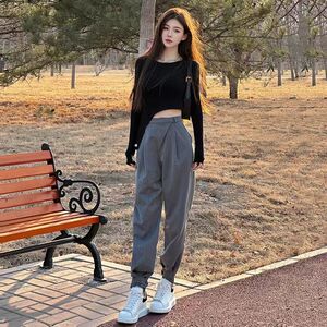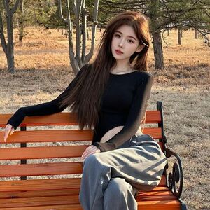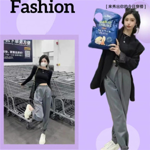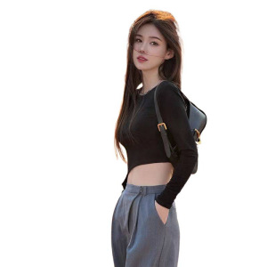 黑色时尚修身长袖T恤女秋季新款休闲气质不规则上衣+裤子两件套