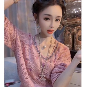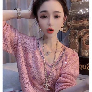 2025春夏新款镂空针织衫长袖晒亮片宽松圆领气质通勤薄款上衣