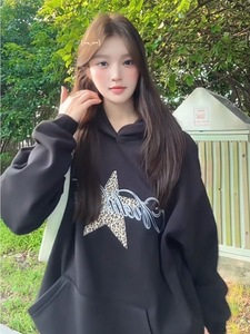 美式复古星星豹纹字母印花百搭重磅套头连帽宽松卫衣ins上衣外套