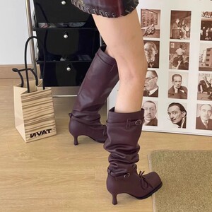 牛皮版~方头复古芭蕾蝴蝶结长筒靴堆堆靴女不过膝细跟高跟长靴子