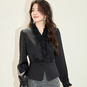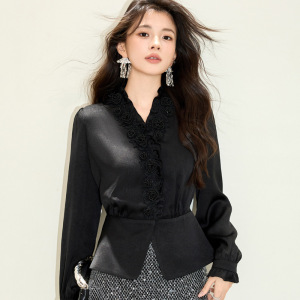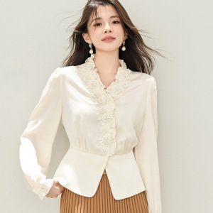 2025秋季新款V领蕾丝拼接长袖衬衫女设计感小众上衣2712