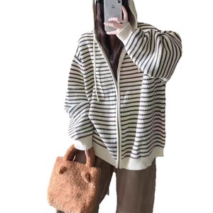 秋冬季新款宽松休闲连帽慵懒风毛衣外套上衣女条纹拉链针织开衫女