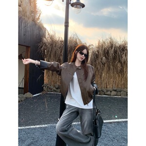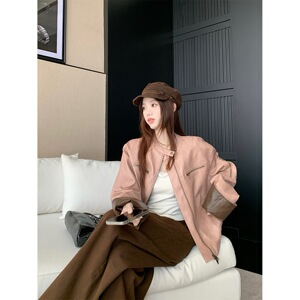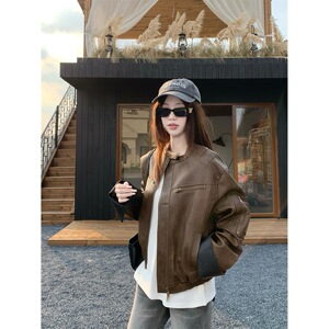 复古撞色立领pu皮外套女秋季高级感宽松皮衣夹克休闲气质开衫上衣