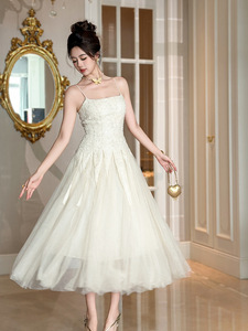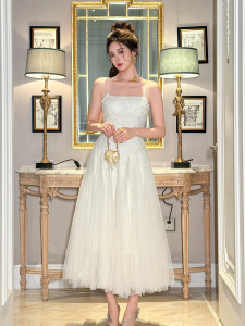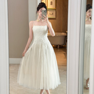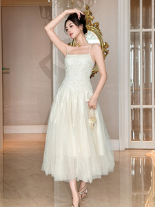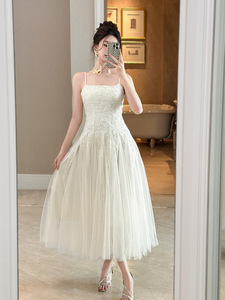 网纱吊带连衣裙女2025夏季新款法式设计感蕾丝拼接收腰长裙9745