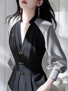 新中式国风盘扣别致上衣2025早春秋新款感气质收腰黑灰撞色衬衫