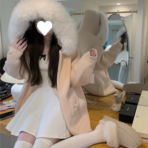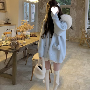 美拉德毛领连帽长袖毛衣外套女冬季新款时尚洋气加厚保暖针织开衫
