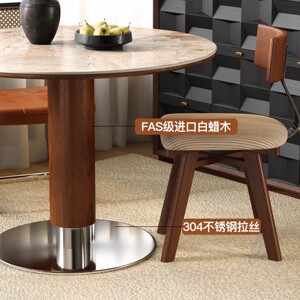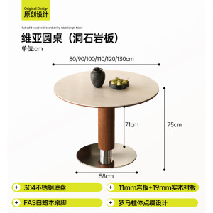 白蜡木实木胡桃色餐桌圆桌家用小户型洽谈中古风洞石岩板餐桌组合