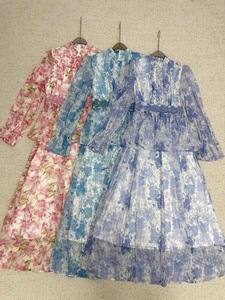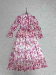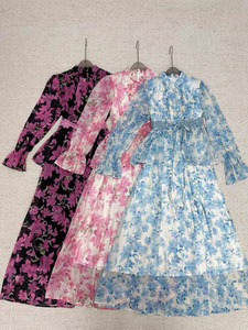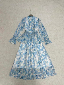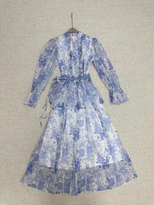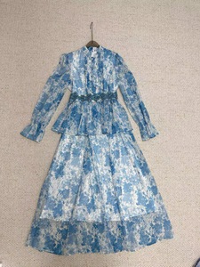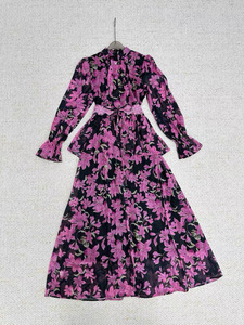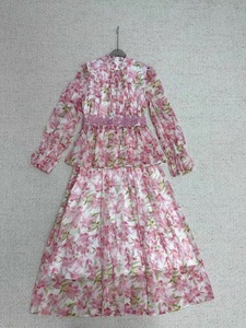 法式浪漫秋夏新款印花长款连衣裙女立领荷叶边钉珠腰封长袖度假裙