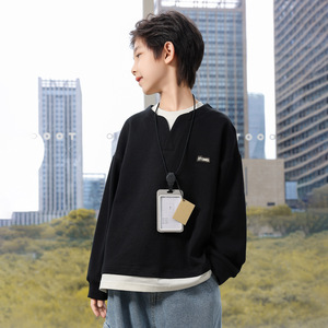 熊猫圆圆双面棉v领假两件男童t恤 2025秋季童装新款儿童卫衣长袖