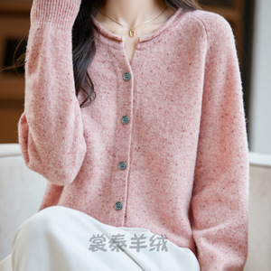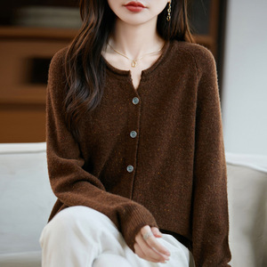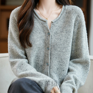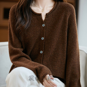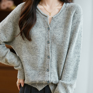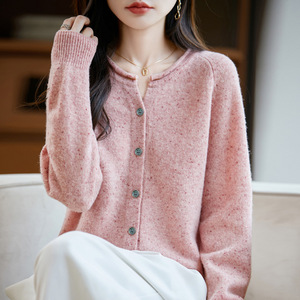 秋冬新款100%羊毛圆领针织开衫卷边彩点子纱加厚上衣外套女毛衣
