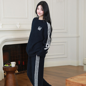 冬季新品半边绒藏青蝴蝶结睡衣女软绵绵加厚保暖珊瑚绒家居服套装