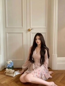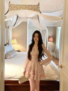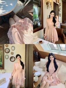 Hotdog 热狗很辣 花落梦夕收腰显瘦V领木耳边繁花长袖连衣裙
