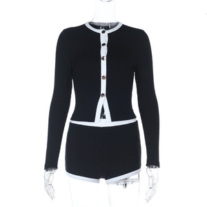 亚马逊跨境撞色边长袖上衣短裤套装女ins秋冬新款修身女装JY25392