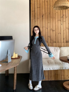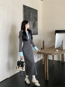 2025灰色长袖针织连衣裙女秋季设计感撞色拼接收腰气质包臀长裙新