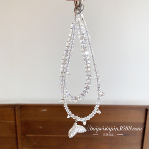 爆闪满钻鱼尾手机链冰透粉水晶精致挂链手腕防丢绳手链双层串珠女