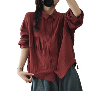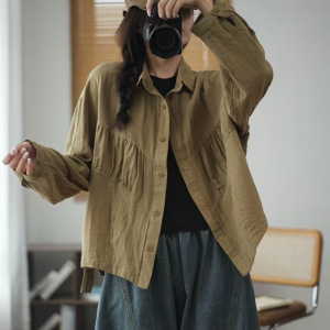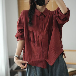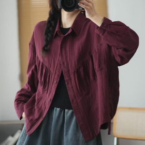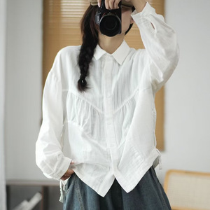 春秋新款文艺长袖衬衫女士双层棉纱纯色褶皱衬衣单排扣打底衫