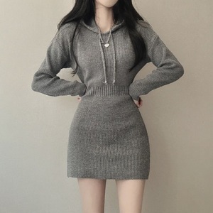 韩国chic秋季法式气质连帽设计修身显瘦加厚针织包臀长袖连衣裙女