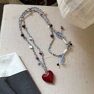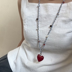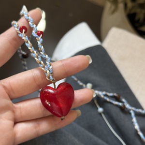 复古彩色编织棉绳红色老琉璃爱心吊坠项链天然石串珠长款毛衣链女