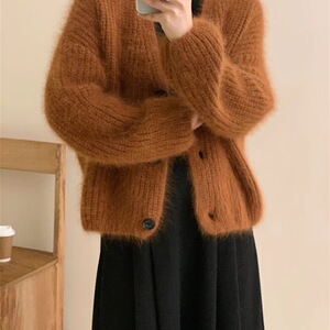 日系温柔风v领长袖毛衣外套软糯仿貂绒针织开衫通勤休闲短款上衣