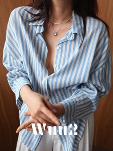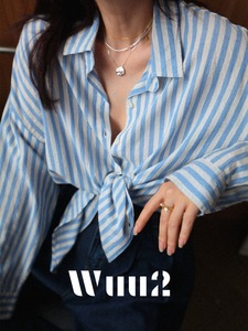 Wuu2 无尽之夏 软糯蓝色条纹棉麻衬衫女慵懒法式休闲宽松复古衬衣