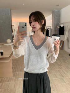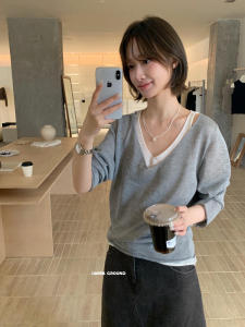 IMISS 2025秋季韩系小心机V领假两件冰丝长袖针织衫女上衣H01188