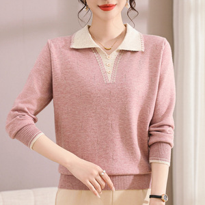 妈妈秋装新款洋气针织打底衫2024中老年女装春秋翻领长袖套头毛衣