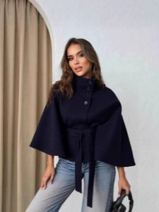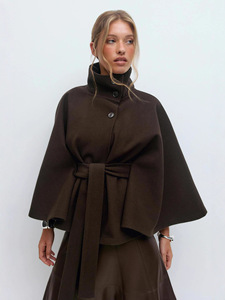 欧美跨境2025新款立领绑带短款夹克毛呢短款外套斗篷式绑带外套女
