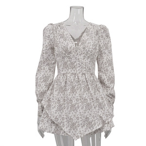 法式复古气质优雅印花V领长袖连衣裙女设计感不规则下摆高腰a字裙