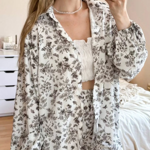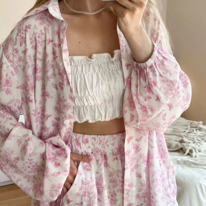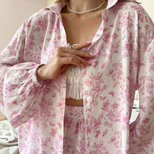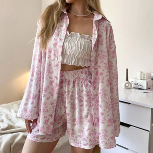 2025跨境欧美秋季新品宽松休闲印花长袖短裤女式睡衣家居服两件套