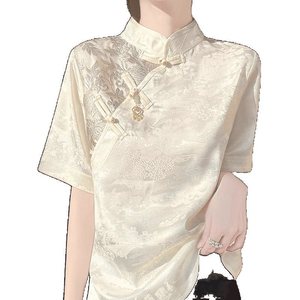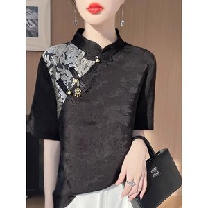 国风立领盘扣短袖上衣复古轻奢大码新中式衬衫恤感女印花