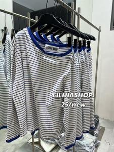 【厂家源头现货直发】早秋休闲宽松撞色条纹斜肩露肩长袖T恤上衣