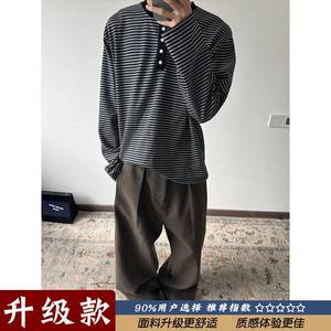 美式复古白条纹撞色拼接亨利领长袖t恤女早秋宽松休闲高街上衣潮