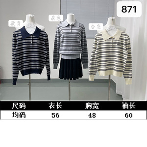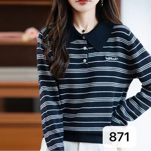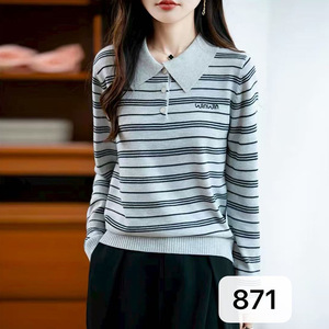 时尚洋气条纹polo领针织衫复古早秋长袖薄款上衣女装毛织衫工厂