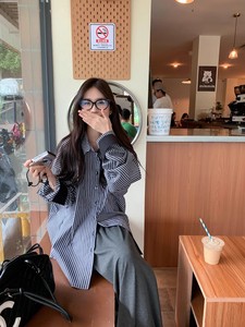 条纹撞色翻领衬衫女大码胖mm2025年新款秋季小众别致气质长袖上衣