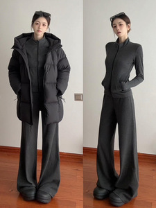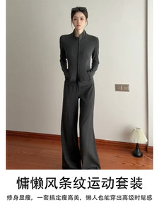 灰色条纹修身外套女早秋季正肩短款卫衣韩系入秋冬穿搭套装老钱风