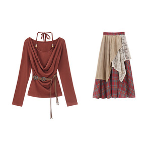 荡领宽松长袖T恤假两件蕾丝拼接格子半身长裙女夏季新款时尚套装