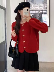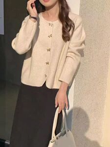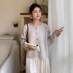 法式小香风针织开衫蝴蝶结秋冬新款金属扣优雅百搭宽松毛衣外套女