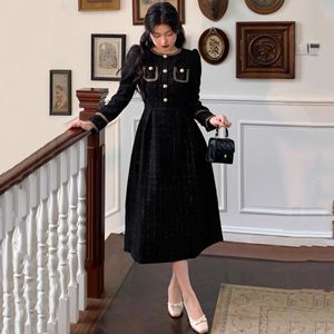 大码胖mm黑色亮丝拼接小香风高级感连衣裙秋冬收腰显瘦长裙200斤