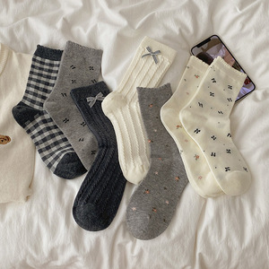 韩国袜子女网红格子蝴蝶结中筒袜无骨芭蕾风碎花堆堆袜女灰色袜子