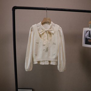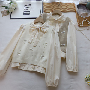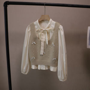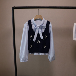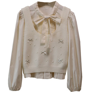 [比正]2025秋季新款韩版甜美长袖衬衫+钉珠蝴蝶结针织马甲女4780